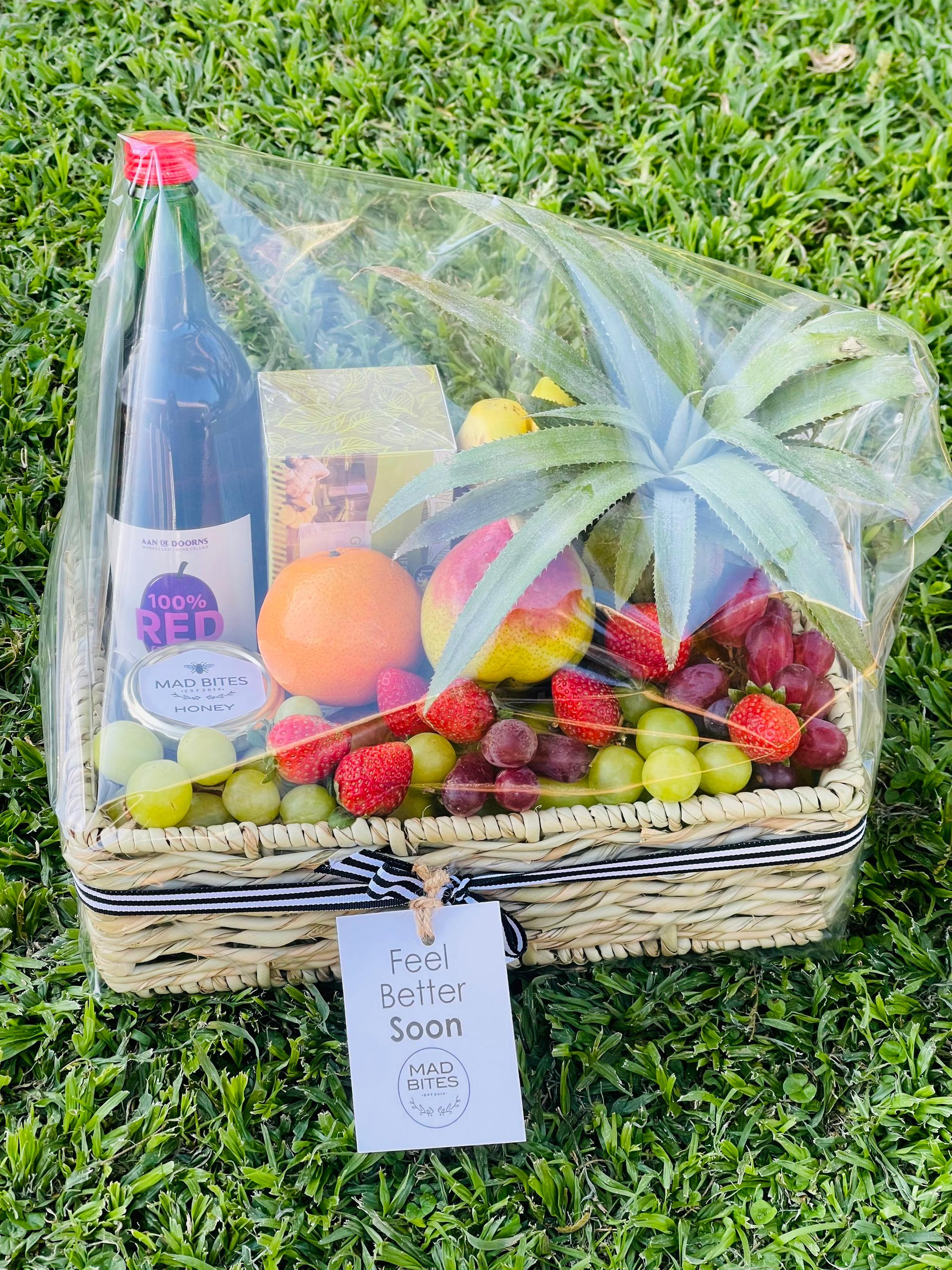 Our Standard Fruit Basket includes a selection of fresh, seasonal fruits, herbal tea, juice, chocolate, and tree nuts. A perfect wellness gift that combines nutrition with indulgence.
