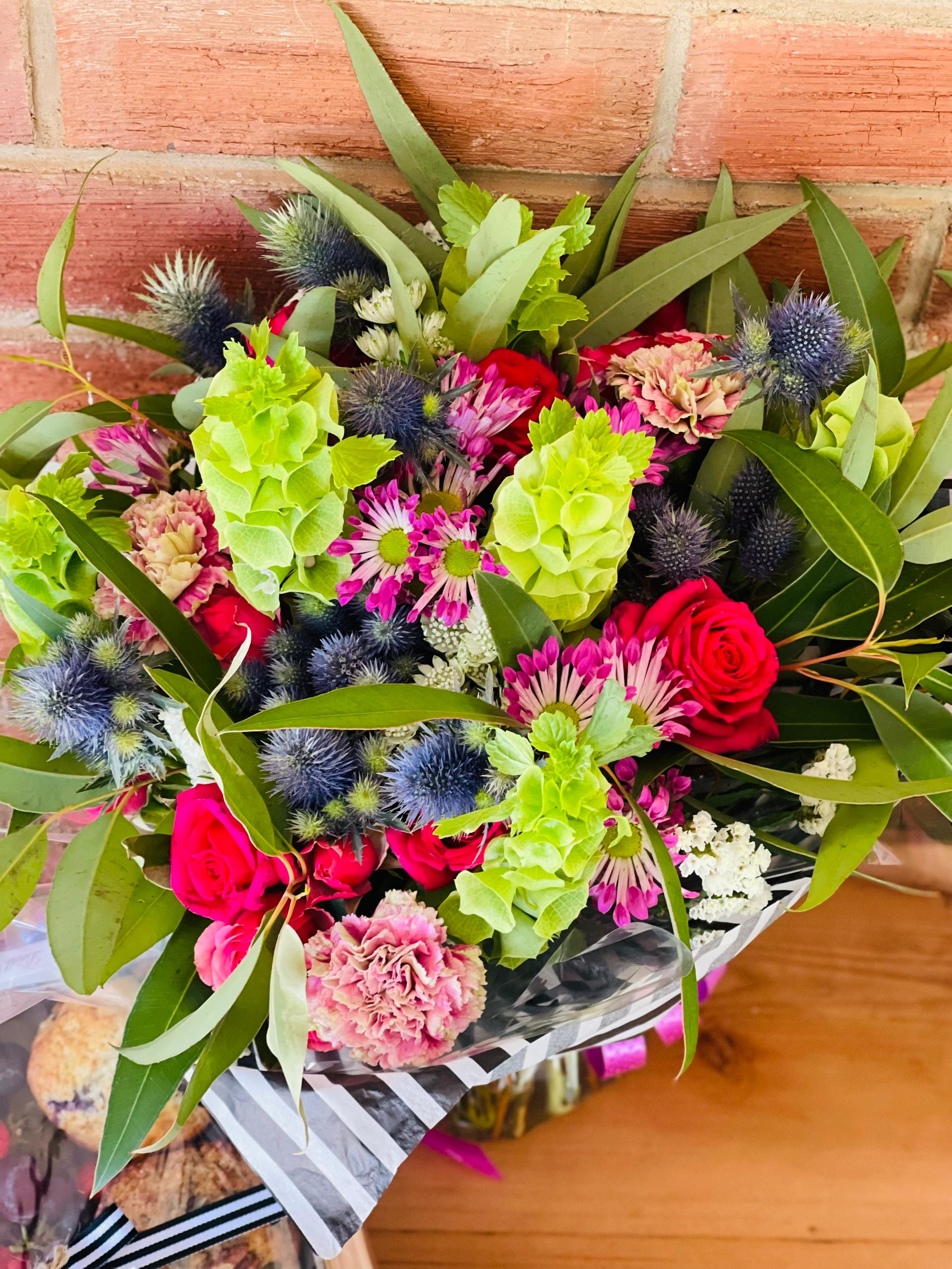A popular choice, this Medium Wrapped Bouquet is ideal for birthdays, thank-yous, and general celebrations. Wrapped in our signature style with seasonal floral variety.